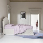 Il giroletto con mantovana nasconde in modo discreto un ampio vano contenitore, soluzione ideale per ottimizzare gli spazi senza rinunciare all’estetica. Questo dettaglio lo rende particolarmente pratico per camere di diverse dimensioni, offrendo al tempo stesso un design sofisticato.