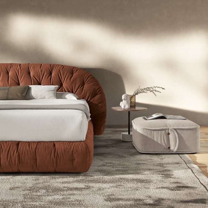 La testiera imbottita, protagonista del design, si distingue per le impunture sartoriali che ne definiscono la forma e aggiungono un tocco di lavorazione artigianale. Non è solo bella da vedere, ma anche estremamente comoda per chi ama leggere o rilassarsi a letto.