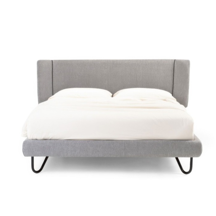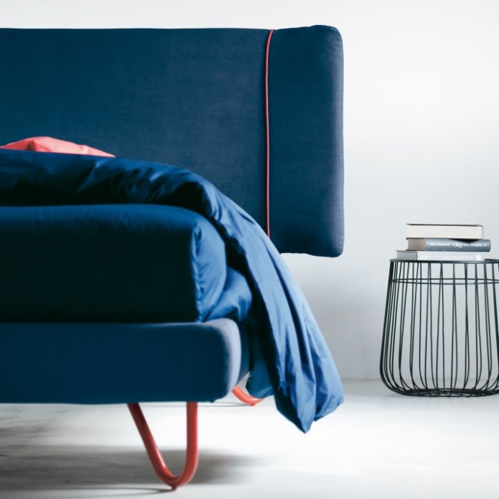 Il profilo della testiera è arricchito da bordature in contrasto, un dettaglio ricercato che si abbina al colore dei piedini in metallo.