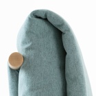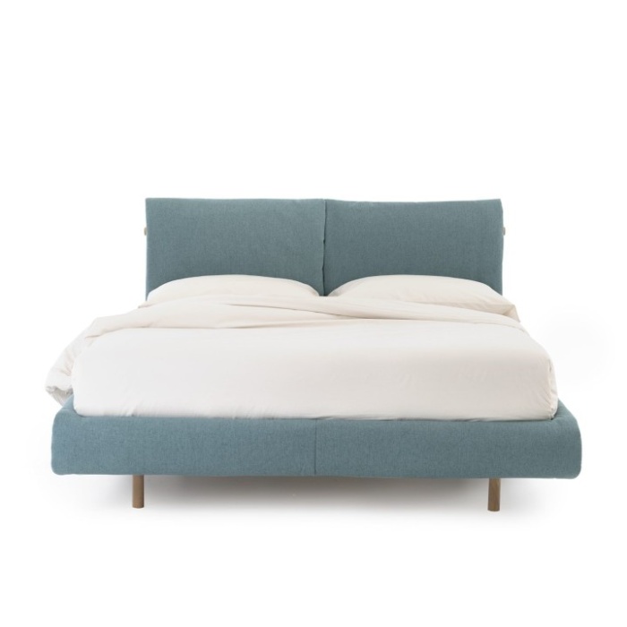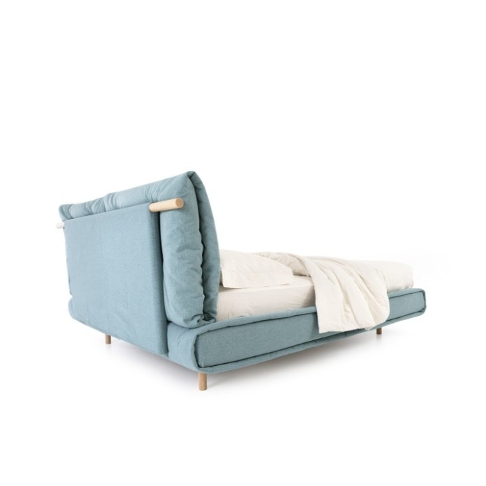 La testata imbottita con cuscini in schiumato è sostenuta da uno schienale con cilindro in legno, che regala un effetto visivo leggero e dinamico, aggiungendo un tocco di originalità al design.