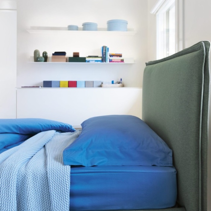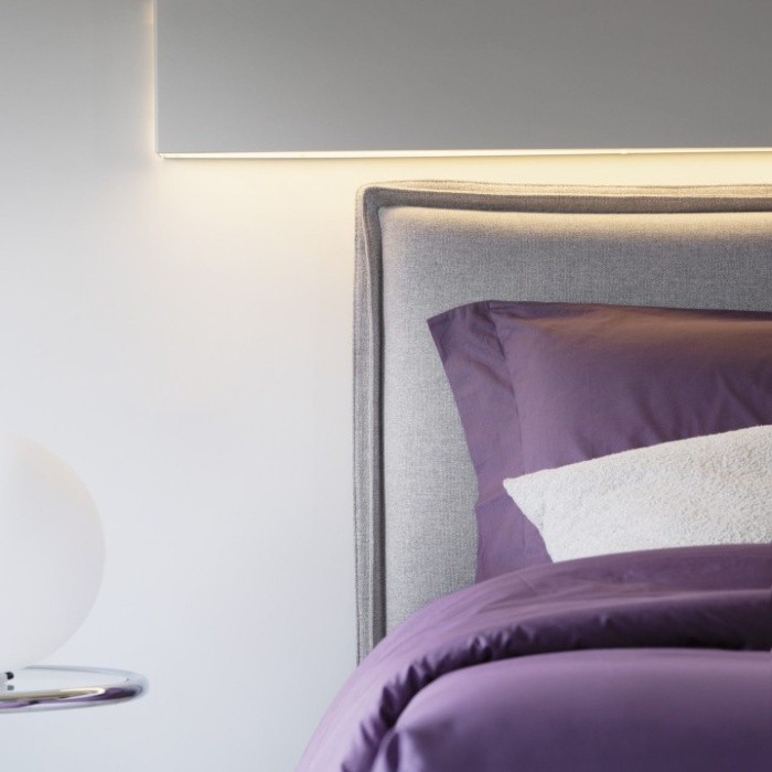 La sua testata, caratterizzata da un doppio bordo rifinito in tessuto a contrasto, crea un piacevole gioco di profondità e movimento, rendendo ogni ambiente più elegante e accogliente. Questo dettaglio sartoriale è ciò che distingue il MOODY di NOCTIS, esprimendo una cura per il design che coniuga estetica e funzionalità.