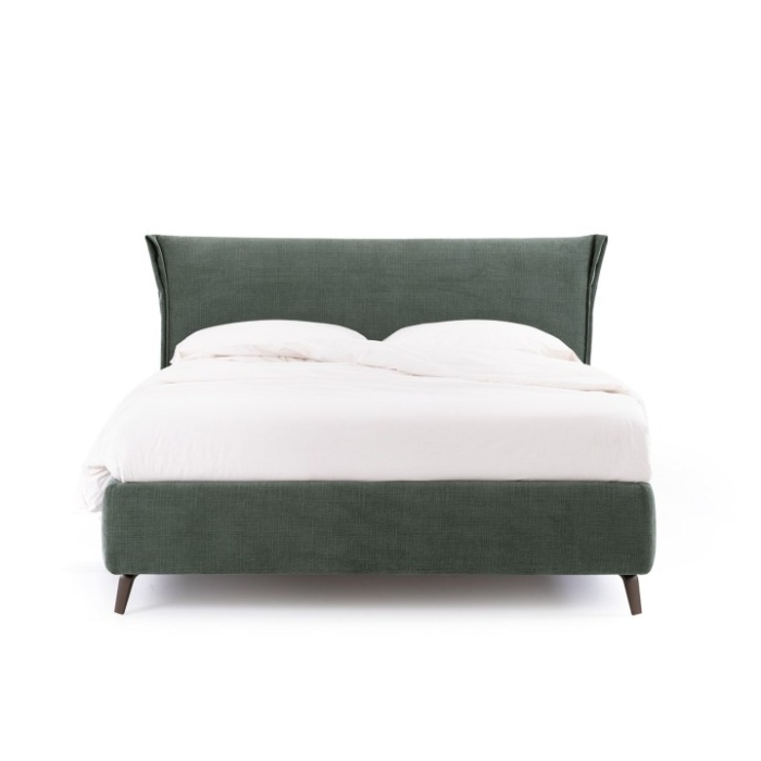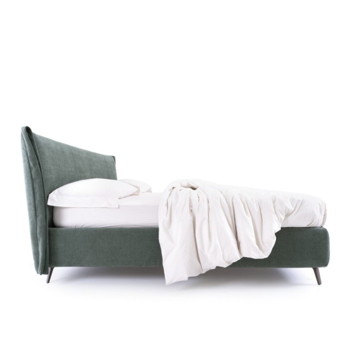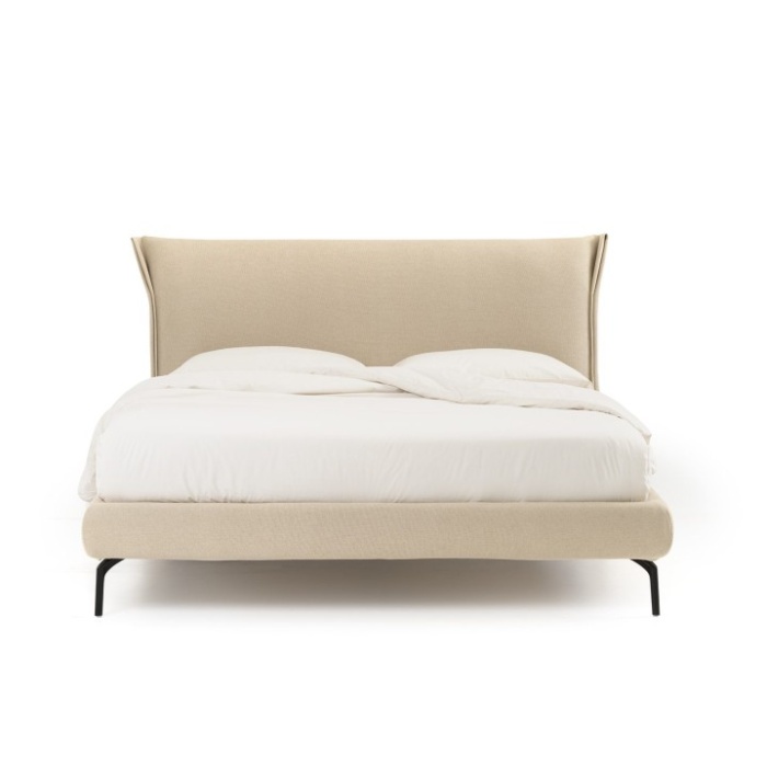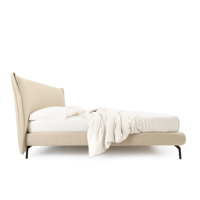 Un dettaglio distintivo è la testiera imbottita, che si piega delicatamente ai lati come la pagina di un libro, evocando l’arte giapponese dell’origami.