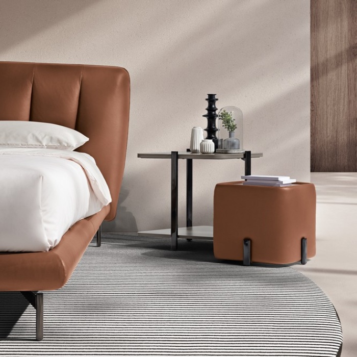 L’imbottitura in poliuretano espanso, morbida e accogliente, garantisce il massimo comfort. Il letto è rivestito con cura artigianale, disponibile sia in tessuto che in pelle, e può essere personalizzato con un bordino a contrasto per un tocco ancora più ricercato.