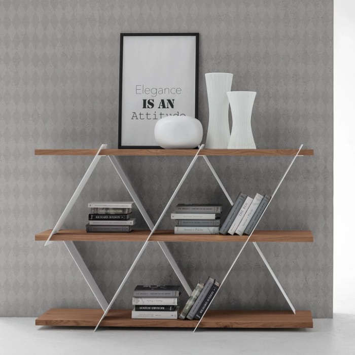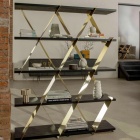 Una struttura leggera ed essenziale, che fonda la sua forza sugli spazi aperti e su triangoli di luce capaci di attraversare e valorizzare la presenza di metallo e legno. Come un castello di carte, Castle si riempie di sfumature, riflessi e trasparenze, assumendo ogni volta un’identità diversa a seconda della finitura scelta. I suoi elementi si combinano in modo dinamico, dando vita a una composizione versatile e modulabile, perfetta sia in posizione verticale che orizzontale. L’aspetto visivo si arricchisce con i giochi di luce creati dalle superfici inclinate, che generano un effetto scenografico ed equilibrato, mai banale.