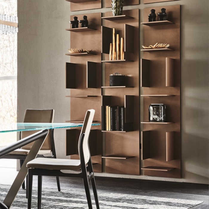 La struttura è composta da un unico elemento verticale con fissaggio a parete, soluzione che dona leggerezza visiva e allo stesso tempo solidità alla composizione. Il progetto prende vita quando due o più moduli vengono affiancati e ruotati di 180°, creando un ritmo grafico armonioso e dinamico. Questa particolare configurazione genera una sequenza di vani rettangolari che scandiscono la parete con ordine e precisione.