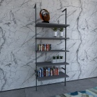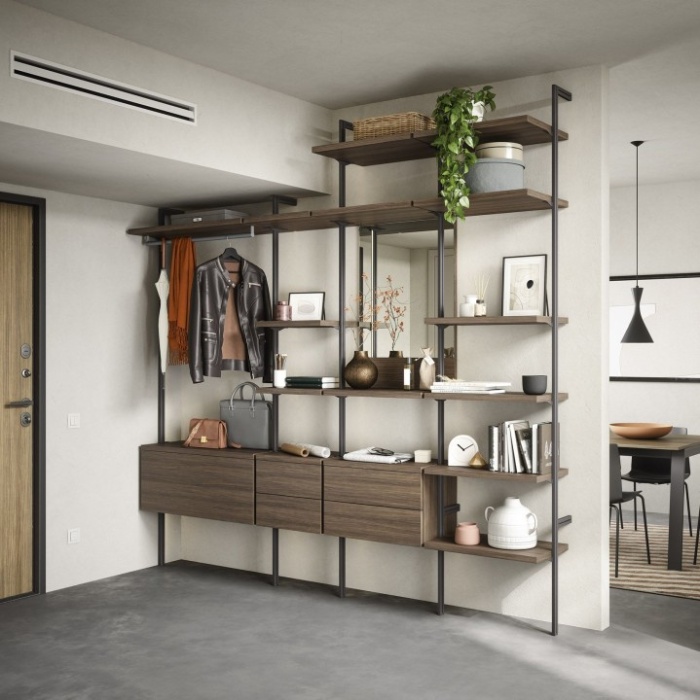 Il sistema Uniko si compone di un montante verticale in alluminio fissato con tasselli al muro tramite almeno 2 traversi orizzontali. Il montante ha due scanalature nelle quali si possono far scorrere, per tutta l’altezza, i supporti forniti per ripiani e contenitori base. I supporti si fissano alla quota desiderata tramite apposita vite.