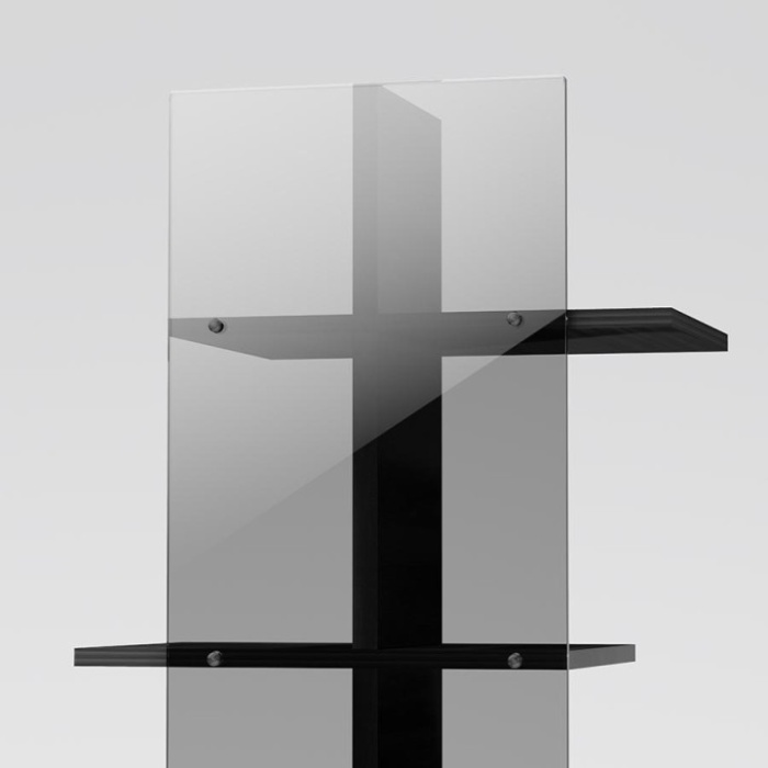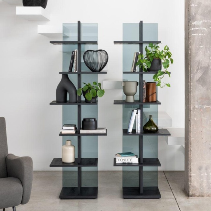 L'elemento distintivo di questa libreria è il suo schienale in vetro temperato spesso 10 mm, disponibile in due versioni per adattarsi a diversi stili e preferenze: