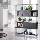 La composizione di Byblos prevede tre ampi ripiani, di cui due sono dotati di vani con ante scorrevoli, pensati per custodire oggetti, documenti o accessori, mantenendo l’ambiente ordinato e organizzato. I ripiani a giorno, invece, offrono lo spazio ideale per esporre libri, piante o decorazioni, rendendo la libreria un complemento estremamente versatile.