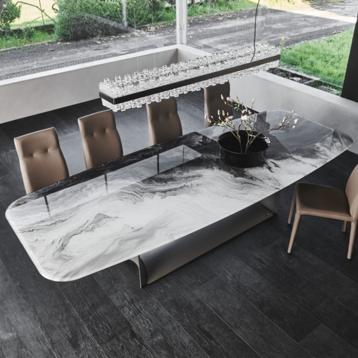 Dragon Keramik e Dragon Keramik Premium sono entrambi tavoli con piano in ceramica con un aspetto prezioso. Il secondo si distingue per il profilo inferiore arrotondato e verniciato, che impreziosisce il piano in ceramica incorniciandolo.