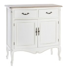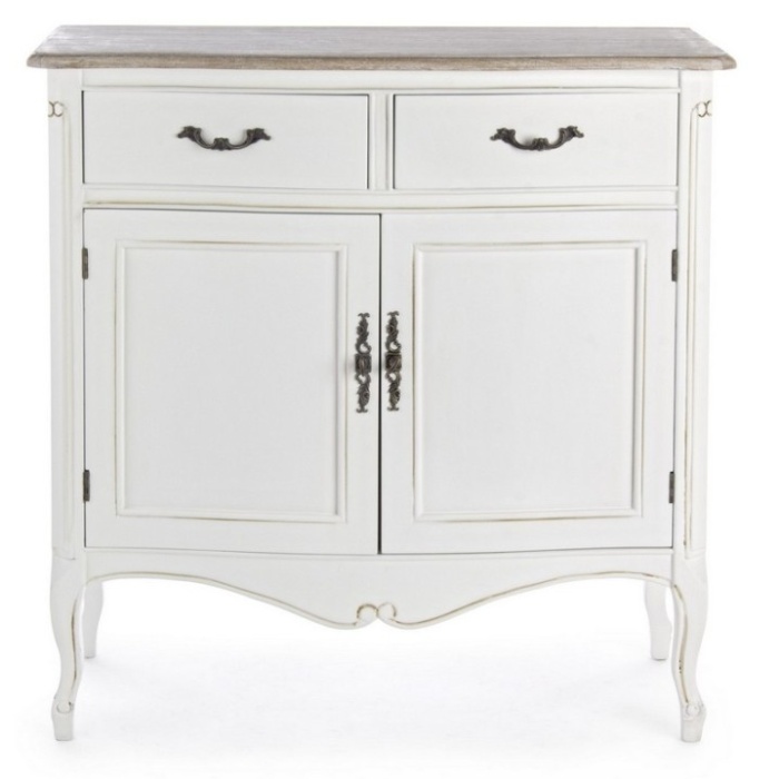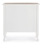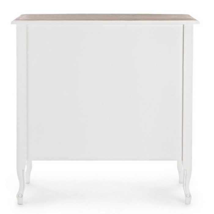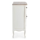 Il piano superiore in legno naturale impiallacciato contrasta piacevolmente con il resto della struttura, verniciata in bianco con una finitura a base d'acqua, ecologica e sicura per l'ambiente. Questa scelta di materiali e colori dona alla credenza un aspetto equilibrato e armonioso, perfetto per spazi tradizionali ma anche per ambienti più moderni che vogliono mantenere un tocco di classicità. Il bianco delicato si adatta facilmente a diverse palette cromatiche, rendendo questo mobile una soluzione flessibile per qualsiasi arredamento.