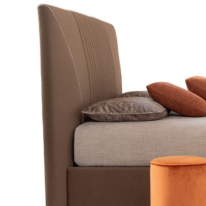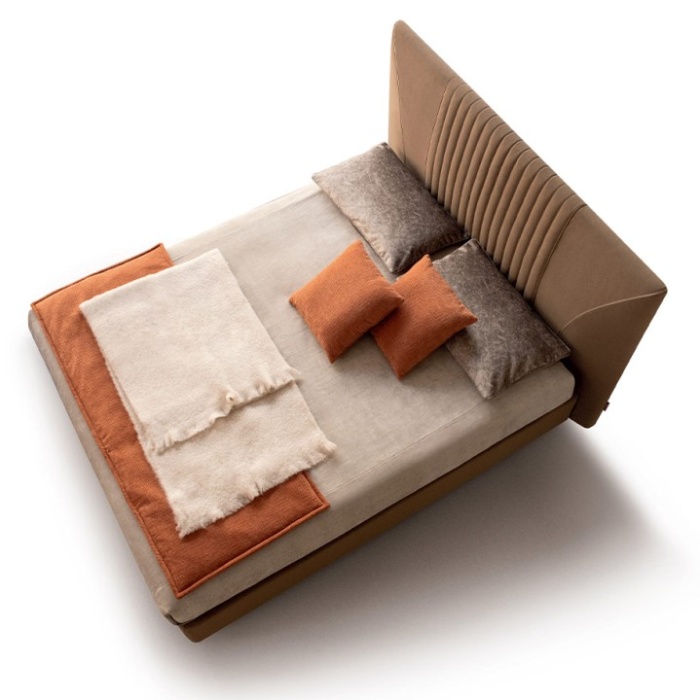 A completare il design, le due curve con gros grain – disponibili in tinta o a contrasto – conferiscono un tocco finale estremamente raffinato e distintivo, trasformando il letto in un vero protagonista della camera da letto.