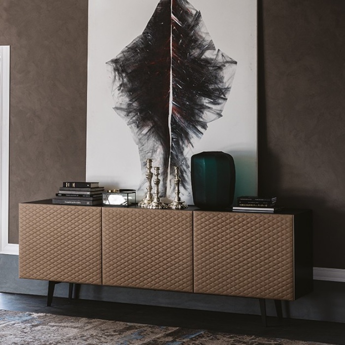 Con il suo morbido rivestimento in pelle o ecopelle trapuntata, la madia Absolut è pensata per rendere l’ambiente living caldo, elegante e accogliente, unendo estetica sofisticata e funzionalità quotidiana. Questo mobile contenitore di design, disponibile nella versione con 2 o 3 ante, si distingue per la qualità dei materiali impiegati e per l’attenzione sartoriale riservata a ogni dettaglio, a partire dal rivestimento frontale soffice e raffinato, vero protagonista del progetto.