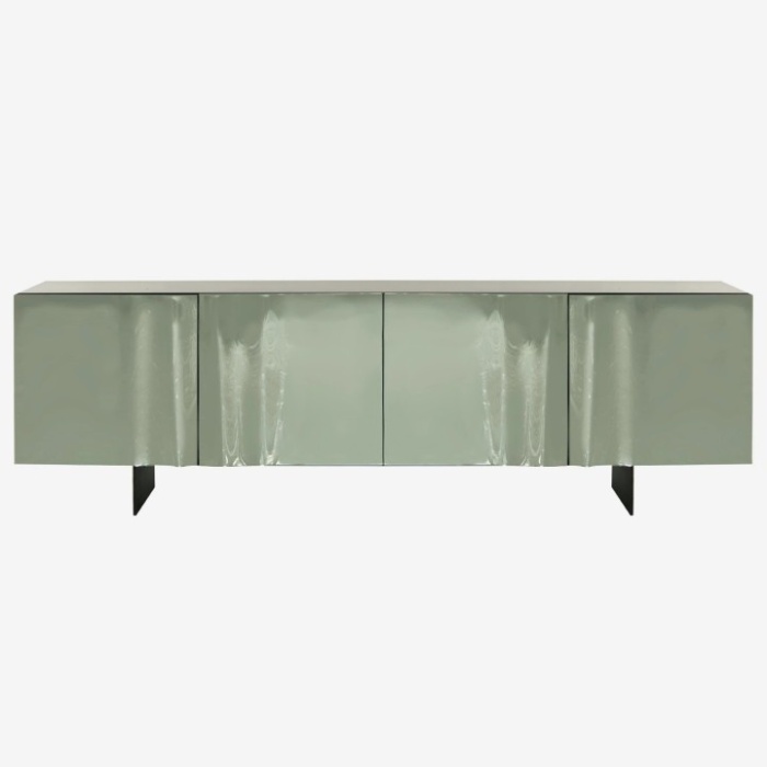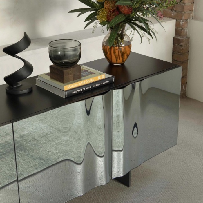 Anemos è una madia che racchiude in sé la poesia del movimento e la raffinatezza del design contemporaneo. Il suo nome, che in greco significa “vento”, richiama la leggera increspatura visiva creata dall’elemento specchiante frontale, che pare animarsi a ogni riflesso di luce, come se fosse sfiorato da una brezza sottile. Questo effetto, ottenuto grazie a una lavorazione esclusiva e minuziosa, conferisce ad Anemos una profondità estetica sorprendente, trasformandola da semplice contenitore a protagonista dello spazio.