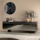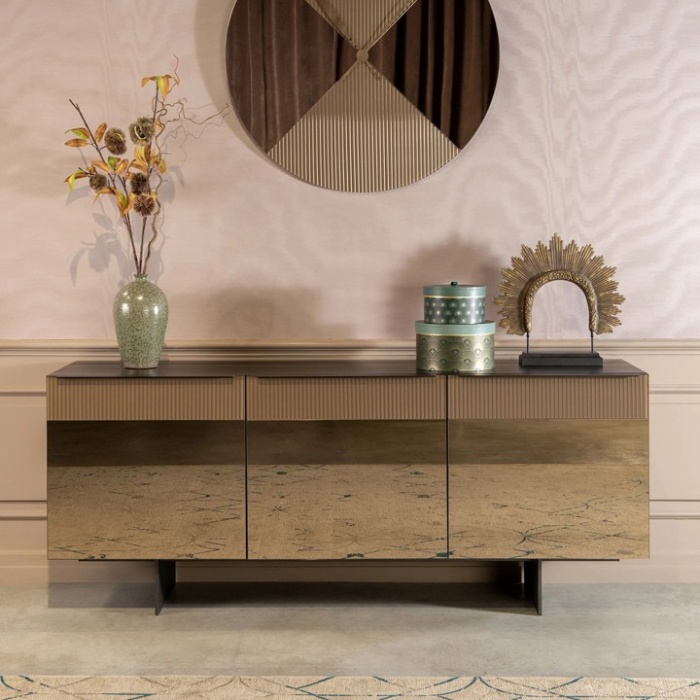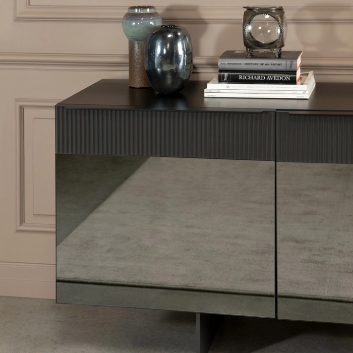 La madia Cannetè è un’elegante espressione di equilibrio tra forme essenziali e materiali preziosi, capace di inserirsi con naturalezza in ambienti sia classici che contemporanei. La sua struttura in laccato nero fa da base a una composizione visiva sofisticata, dove le ante in specchio fumé o bronzo moltiplicano la luce e gli spazi, creando affascinanti riflessi che dialogano con l’ambiente circostante. Il dettaglio distintivo di questa madia risiede nella cornice superiore in vetro cannettato, caratterizzata da una lavorazione rigata verticale che aggiunge profondità e movimento visivo, elevando l’insieme con un tocco di design raffinato. La texture del vetro crea giochi di luce discreti ma continui, che esaltano la purezza delle linee e la linearità della struttura.