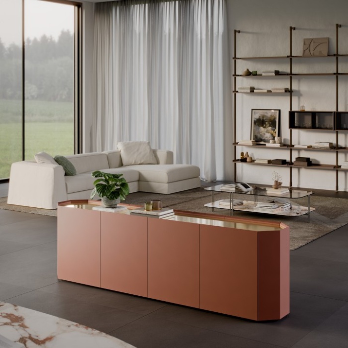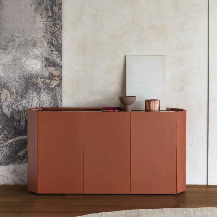 Contenitore e ante in mdf melamminico verniciato opaco. Ripiani interni in cristallo trasparente temperato spessore 8 mm. Top in cristallo extrachiaro temperato verniciato opaco spessore 8 mm. Base in acciaio cromato. Finiture come da campionario.