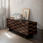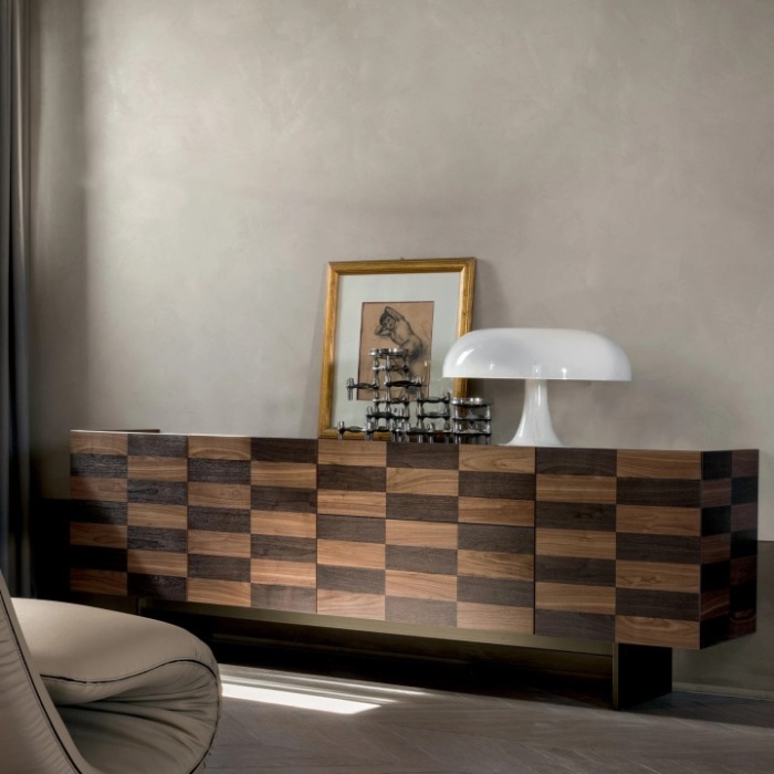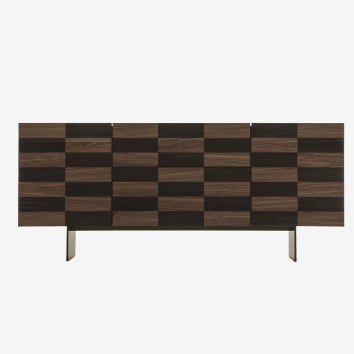 Colosseo è una madia contenitore in legno dal forte impatto visivo, resa unica dalla raffinata lavorazione ad intarsio laser che decora le sue superfici con precisione artigianale. Realizzata in pregiato noce canaletto, unisce la calda matericità del legno alla leggerezza visiva della base in metallo finitura bronzo pietra, che dona un tocco contemporaneo.