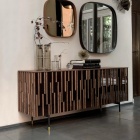 Un programma giorno e notte pensato per arredare con continuità, coerenza stilistica e un tocco di raffinata eleganza. Questa collezione si distingue per la sua composizione completa, che unisce funzionalità e design sofisticato in ogni dettaglio. Le ante, realizzate con effetto specchio, vengono impreziosite da gocce in legno massello, applicate con estrema cura artigianale, a testimonianza dell’attenzione per i materiali pregiati e per la manifattura di eccellenza. Il top sagomato e stondato si presenta fine e sofisticato, richiamando le forme più fluide e armoniose del design contemporaneo.