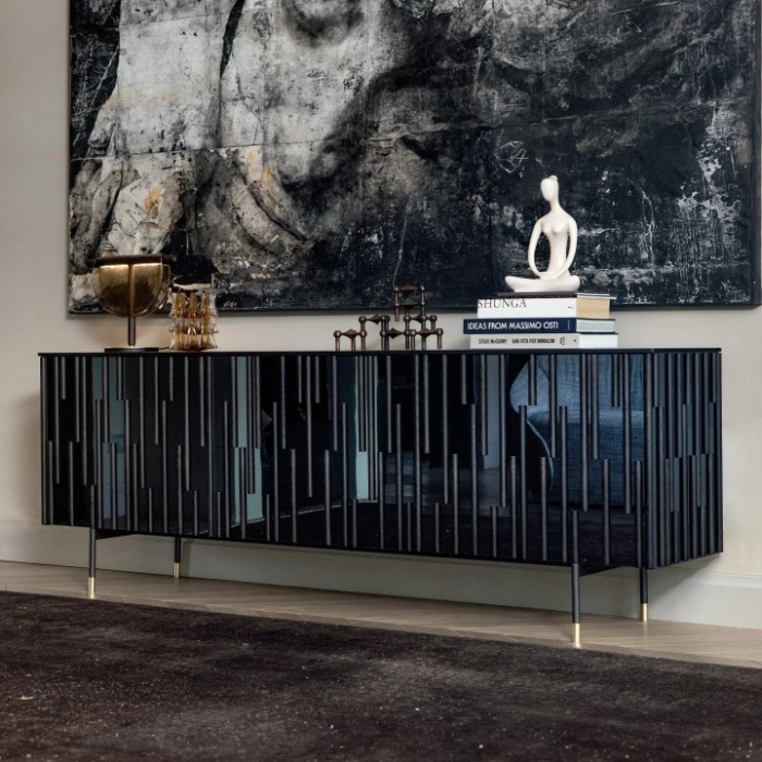 La struttura in metallo è solida e leggera al tempo stesso, arricchita da inserti in finitura oro, che donano un accento di lusso discreto e ricercato. Ogni elemento è stato pensato per creare un’atmosfera esclusiva, in cui nulla è lasciato al caso: una visione d’arredo completa, in grado di valorizzare e nobilitare qualsiasi ambiente con carattere, personalità e un senso di armonia senza tempo.