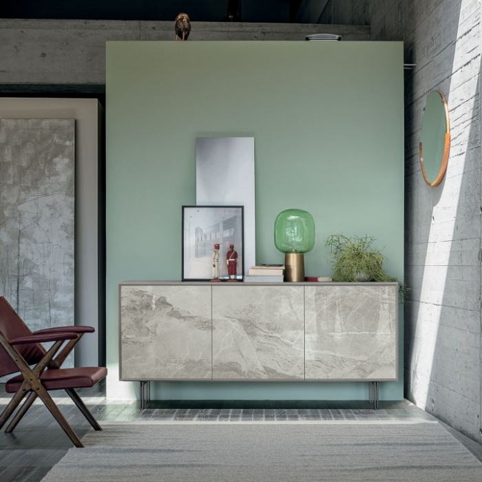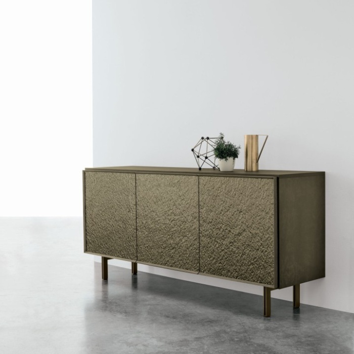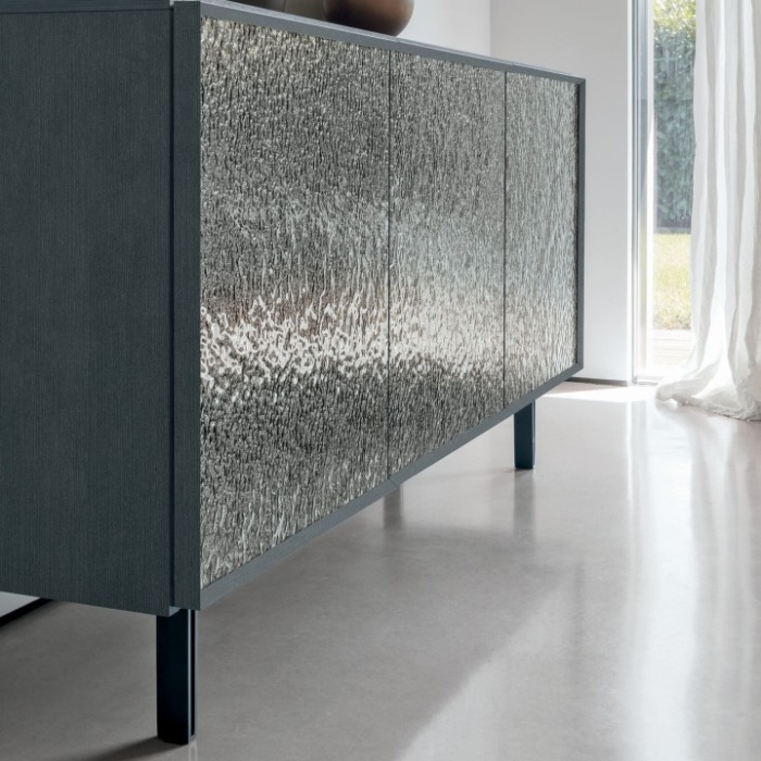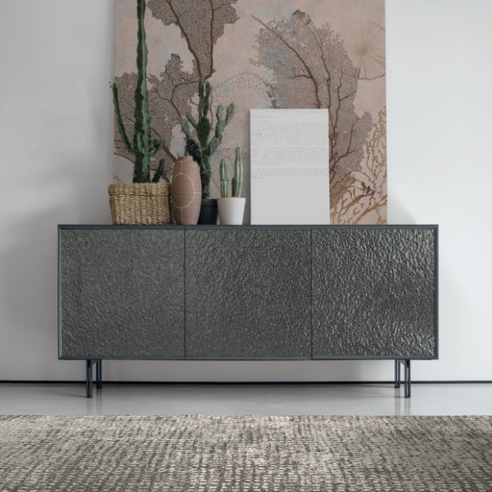 Personalizza la tua madia Giunone scegliendo tra piedini in metallo verniciato per uno stile contemporaneo e robusto, oppure opta per un basamento centrale in laminato spazzolato per un'estetica elegante e minimalista.