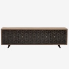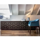 Granda rappresenta fantasie barocche che si innestano su piani rettangolari, lievi e precisi, creando un equilibrio perfetto tra classicità e contemporaneità. Il lusso si presenta qui nella sua veste più pura, in un intreccio sapiente di legno e vetro, dove ogni dettaglio è pensato per esaltare raffinatezza e prestigio. Le superfici, decorate con motivi elaborati, richiamano l’eleganza senza tempo delle antiche dimore nobiliari, mentre la struttura mantiene una leggerezza formale che la rende perfettamente integrabile anche in ambienti più moderni. Il tocco finale è affidato ai meravigliosi pomoli Swarovski, veri e propri gioielli incastonati sul mobile, che rifrangono la luce in un caleidoscopio di riflessi brillanti, rendendo ogni apertura un gesto di lusso quotidiano.
