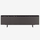 Madia contenitore a tre o quattro ante, rivestite in pellicola bronzo realizzata con tecnologia post-forming, per una finitura continua e perfettamente rifinita. Il top curvato in monolastra di vetro martellato nero aggiunge un tocco di eleganza materica, creando un contrasto sofisticato con la calda brillantezza delle superfici. I piedini in metallo bronzato sollevano la composizione, rendendola visivamente leggera e strutturalmente solida. Il nome Magma richiama la fluidità e l’energia visiva sprigionata dalla texture del vetro, che sembra sciogliersi sulle superfici in legno creando un dialogo dinamico tra materiali.