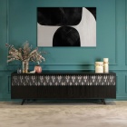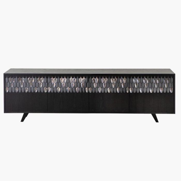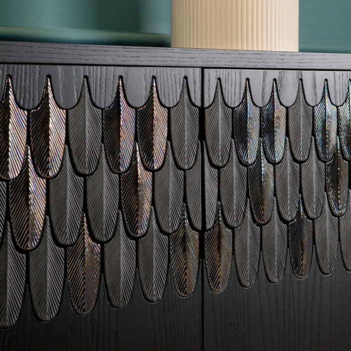 Plumage è molto più di una collezione: è un progetto decorativo che, applicato a questo arredo, racconta una storia di eleganza, ricercatezza e passione per il dettaglio. Il risultato è una madia che diventa installazione artistica, capace di dialogare con ambienti sofisticati e dalla forte personalità.