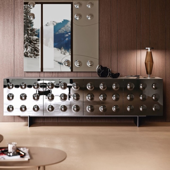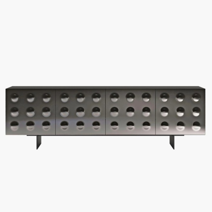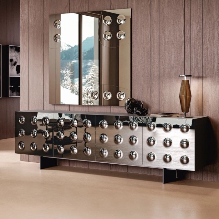 Madia contenitore a tre o quattro ante in cristallo specchiato bronzo o fumè, con struttura in legno laccato nero lucido e piedini in metallo verniciato. Il design dirompente della madia Rock si distingue per una forte personalità estetica e una presenza scenica che la rende perfetta per ambienti contemporanei. Il vero protagonista è il vetro lavorato in monolastra, che ospita nove bolle a rilievo per ciascuna anta: una scelta formale audace, che crea un effetto tridimensionale sorprendente, capace di riflettere e moltiplicare la luce. La combinazione di materiali specchianti, superfici lucide e dettagli in rilievo genera un gioco visivo potente, che dona profondità e movimento alla composizione.