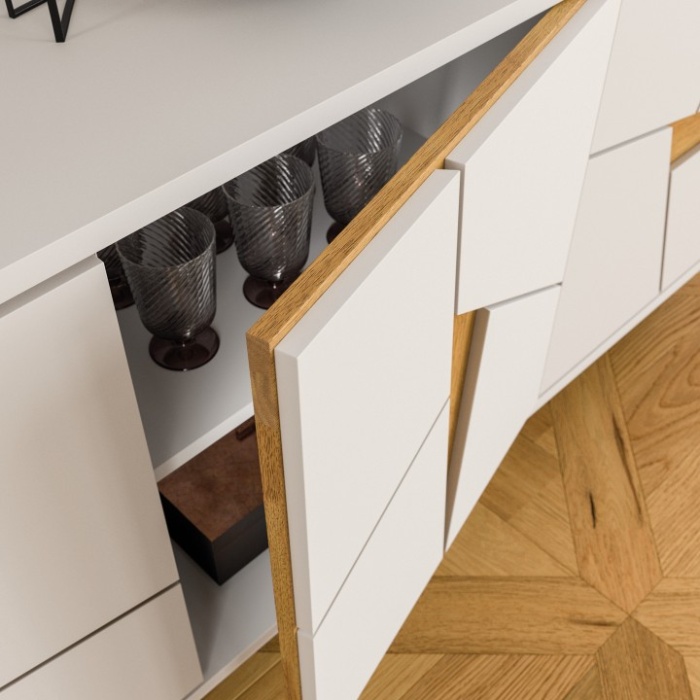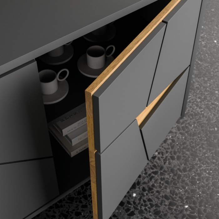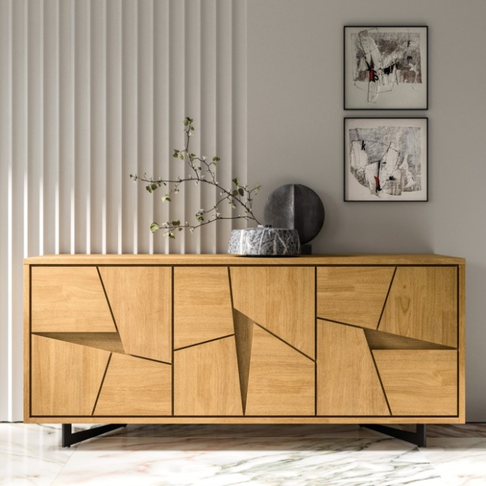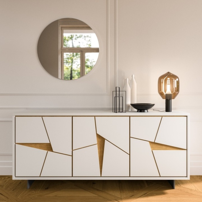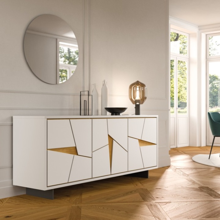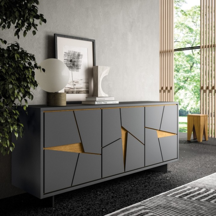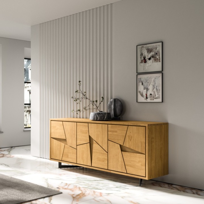 Madia Special Fgf Mobili, prodotta interamente in legno massello. Ante di forte spessore costruite con un pannello posteriore e 4 inserti sovrapposti che creano un gioco di forme geometriche, disponibile anche con finiture a contrasto.