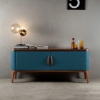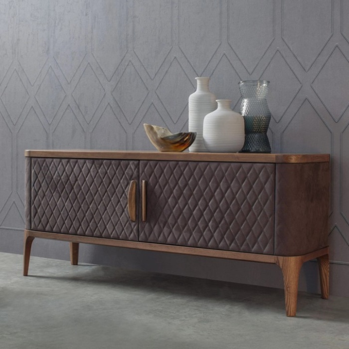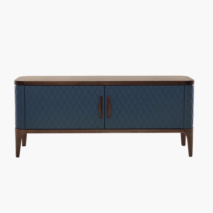 Tiffany è una madia – disponibile sia in versione bassa che alta – che rappresenta la perfetta sintesi tra lusso delicato e artigianalità italiana. I suoi volumi sono definiti da una struttura in legno di frassino, proposta nelle eleganti finiture noce Canaletto, rovere scuro o frassino nero, che si accostano con naturalezza al rivestimento trapuntato in pelle o eco-pelle, disponibile in una vasta gamma di colorazioni. La trapuntatura realizzata a mano richiama la qualità delle migliori lavorazioni dell’imbottito Made in Italy, conferendo al mobile una raffinatezza sartoriale. Il risultato è un arredo che unisce due mondi differenti – quello del mobile contenitore e dell’imbottito – in una fusione armonica di materiali, texture e dettagli.