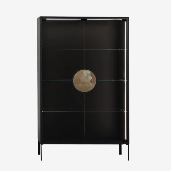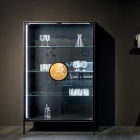 Dot è una madia dal carattere minimal chic, in cui forma leggera e design deciso si fondono in un linguaggio estetico raffinato ed essenziale. La struttura è pensata per offrire un impatto visivo armonico ma allo stesso tempo audace, grazie alla scelta di materiali preziosi e moderni. Il protagonista della composizione è un cerchio perfetto, elemento distintivo che funge da maniglia, disponibile in legno o in gres porcellanato, materiali che donano alla madia una presenza sofisticata e scultorea. Le ante in cristallo trasparente o fumè, oltre a conferire profondità visiva, permettono di valorizzare con discrezione l’interno del mobile, esaltando così anche il contenuto.