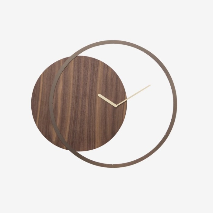 Orologio analogico dal design minimalista e raffinato, caratterizzato da un armonioso intreccio tra legno e metallo che ne esalta la purezza estetica. La combinazione di materiali caldi e freddi crea un equilibrio visivo perfetto, rendendolo un complemento versatile per ambienti moderni o dal gusto contemporaneo. La lancetta in finitura oro satinato aggiunge un tocco di classe discreto ma distintivo, illuminando il quadrante con eleganza.