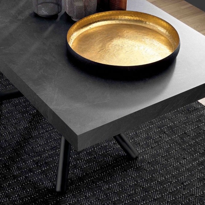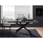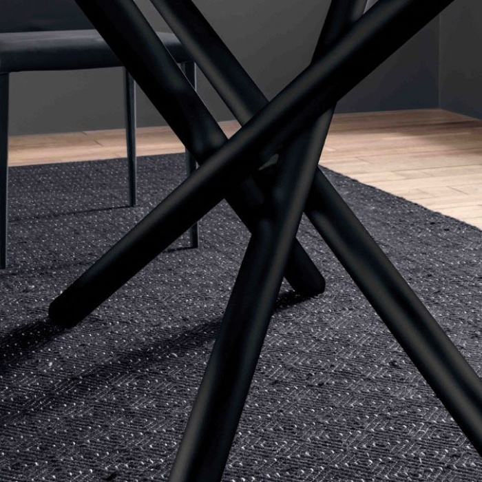 La forza visiva del modello Fahrenheit risiede nel contrasto sapiente tra la base e il top. La struttura portante è realizzata in metallo di alta qualità, caratterizzata da un gioco di linee inclinate che si incrociano centralmente. Questa configurazione a "centropagina" garantisce una stabilità assoluta senza interferire con lo spazio per le gambe dei commensali, permettendo di sfruttare appieno il perimetro del tavolo in totale comfort. La base è personalizzabile in numerose finiture goffrate, tra cui spiccano il moderno Grafite (M11), il caldo Bronzo (M19) e il lussuoso Oro (M51), permettendo accostamenti cromatici sartoriali con il resto dell'arredo.