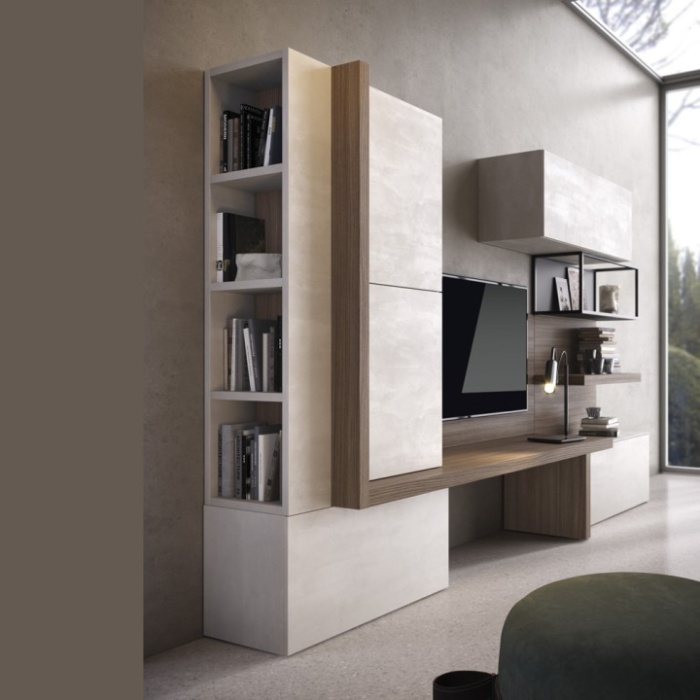 Uno dei tratti distintivi di questo sistema è l’innovativo fianco terminale trasformato in libreria a giorno. Questa soluzione architettonica non solo ottimizza lo spazio di contenimento, ma trasforma il modulo finale in un elemento scenografico dove esporre libri, oggetti d’arte e ricordi preziosi. La libreria si integra perfettamente nella struttura, diventando il vero punto focale della parete attrezzata e conferendo un senso di apertura e leggerezza visiva all'intera stanza.