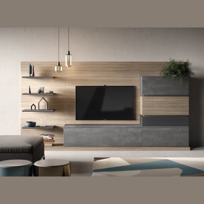 Il carattere distintivo di Living Pure risiede nell’uso sapiente delle finiture: le essenze in noce e l’effetto spatolato conferiscono una profondità tattile e visiva che rende l’ambiente grintoso e, al contempo, estremamente elegante. A spezzare la linearità e aggiungere un tocco di dinamismo intervengono gli elementi a contrasto, che possono essere personalizzati in laccato opaco o attraverso l'esclusiva anta Oblique. Questi dettagli non sono solo decorativi, ma creano una personalità decisa sulla parete attrezzata, catturando l'attenzione grazie a giochi di volumi e geometrie ricercate.