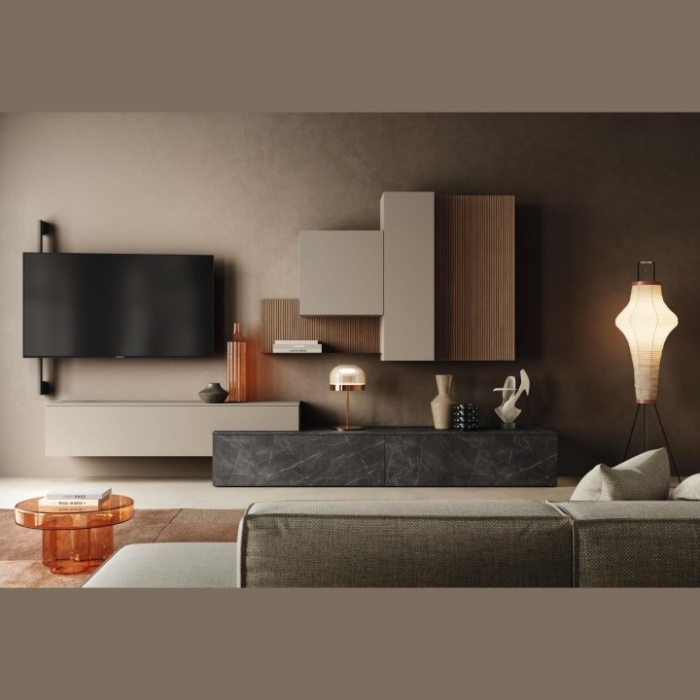 Il vero cuore estetico di Living Space risiede nel contrasto tra le sue dimensioni: la larghezza accentuata mette in risalto un ampio pannello decorativo frontale che trasforma il mobile in un elemento di design scenografico. Ma la bellezza non è l'unico pregio: il fianco del modulo è sapientemente attrezzato con una serie di mensole a giorno, creando un terminale raffinato ideale per esporre libri, oggetti d'arte o complementi d'arredo. Questa configurazione aggiunge movimento e personalità, fungendo da punto focale che conferisce leggerezza e dinamismo all'intera parete attrezzata.