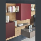 composizione L6C27 con elementi pensili LAMPO laccati Amarena, Vinaccia e Bianco 10, pannelli boiserie impiallacciati in rovere Nodato Naturale mensole in metallo spessore 3 mm laccate Visone opaco. Basi con contenitori LAMPO laccati Visone opaco.