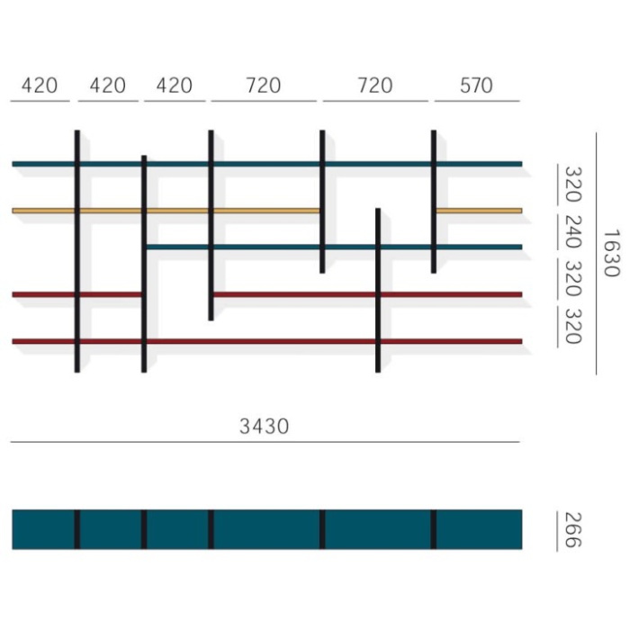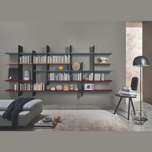 composizione L6C41 con mensole in posizionamento libero profondità 266 e spessore 30 mm, laccate Avio, Terracotta, Vinaccia e Nero opaco.