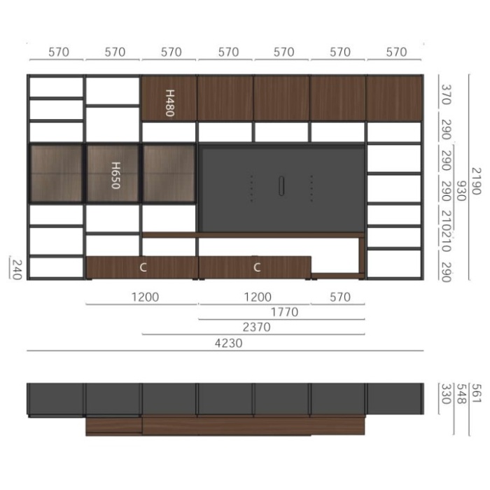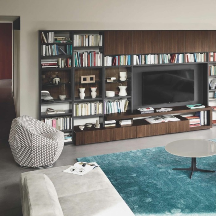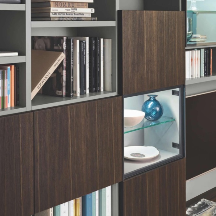 Struttura: (fianchi, divisori, schienali) materici ed essenze con venatura orizzontale - (ripiani) materici ed essenze con venatura orizzontale.Frontali: materici con venatura orizzontale fino ad altezza 1916 mm. Essenze con venatura orizzontale per i roveri tinti e noce o con venatura verticale per il rovere termotrattato.