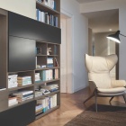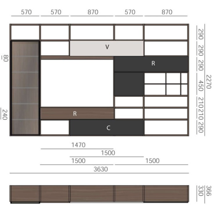 Struttura: (fianchi, divisori, schienali) materici ed essenze con venatura orizzontale - (ripiani) materici ed essenze con venatura orizzontale.Frontali: materici con venatura orizzontale fino ad altezza 1916 mm. Essenze con venatura orizzontale per i roveri tinti e noce o con venatura verticale per il rovere termotrattato.
