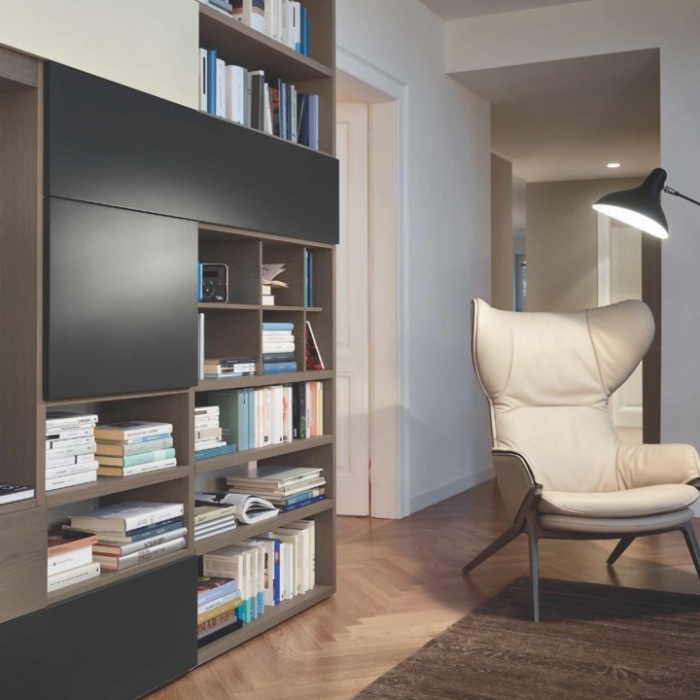 Per la scocca lucida di elementi con anta si intende l’esterno dei fianchi e relativi bordi perimetrali. L’interno e le schiene sono forniti con il corrispondente colore laccato opaco, mentre per elementi con cassetto l’interno è sempre tramato Juta.