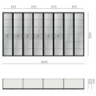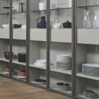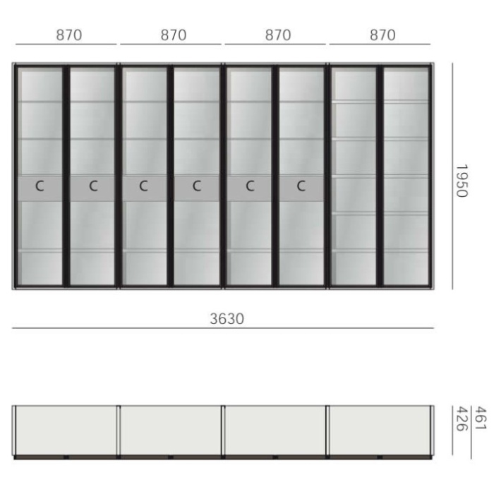Realizzati da un telaio strutturale in alluminio con maniglia annegata o scavata nel profilo con finitura laccata opaca o epossidico Piombo e Brown. Vetri temperati spessore 4 mm trasparente o trasparente fumè (anta Scrigno), laccati lucidi e satinati o stop-sol (anta sez. 53 x 20 mm) e trasparente (anta sez. 20 x 20 mm).