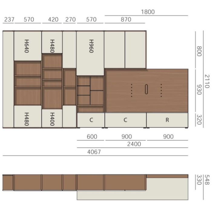 Struttura: (fianchi, divisori, schienali) materici ed essenze con venatura orizzontale - (ripiani) materici ed essenze con venatura orizzontale.Frontali: materici con venatura orizzontale fino ad altezza 1916 mm. Essenze con venatura orizzontale per i roveri tinti e noce o con venatura verticale per il rovere termotrattato.