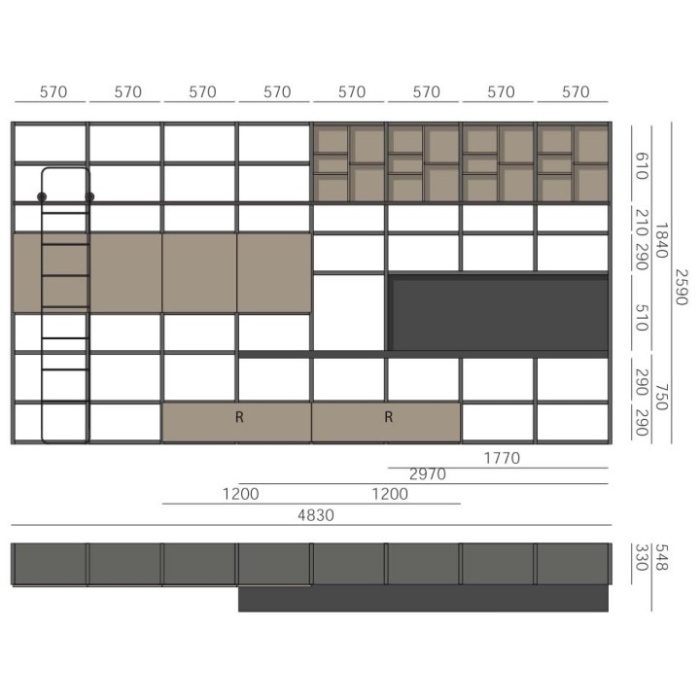 Struttura: (fianchi, divisori, schienali) materici ed essenze con venatura orizzontale - (ripiani) materici ed essenze con venatura orizzontale.Frontali: materici con venatura orizzontale fino ad altezza 1916 mm. Essenze con venatura orizzontale per i roveri tinti e noce o con venatura verticale per il rovere termotrattato.