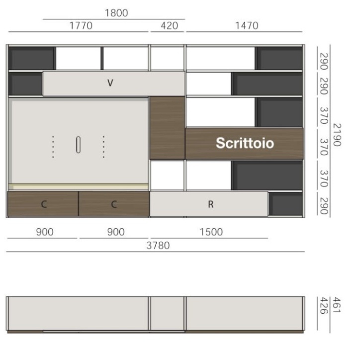 Struttura: (fianchi, divisori, schienali) materici ed essenze con venatura orizzontale - (ripiani) materici ed essenze con venatura orizzontale.Frontali: materici con venatura orizzontale fino ad altezza 1916 mm. Essenze con venatura orizzontale per i roveri tinti e noce o con venatura verticale per il rovere termotrattato.