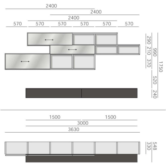 Struttura: (fianchi, divisori, schienali) materici ed essenze con venatura orizzontale - (ripiani) materici ed essenze con venatura orizzontale.Frontali: materici con venatura orizzontale fino ad altezza 1916 mm. Essenze con venatura orizzontale per i roveri tinti e noce o con venatura verticale per il rovere termotrattato.