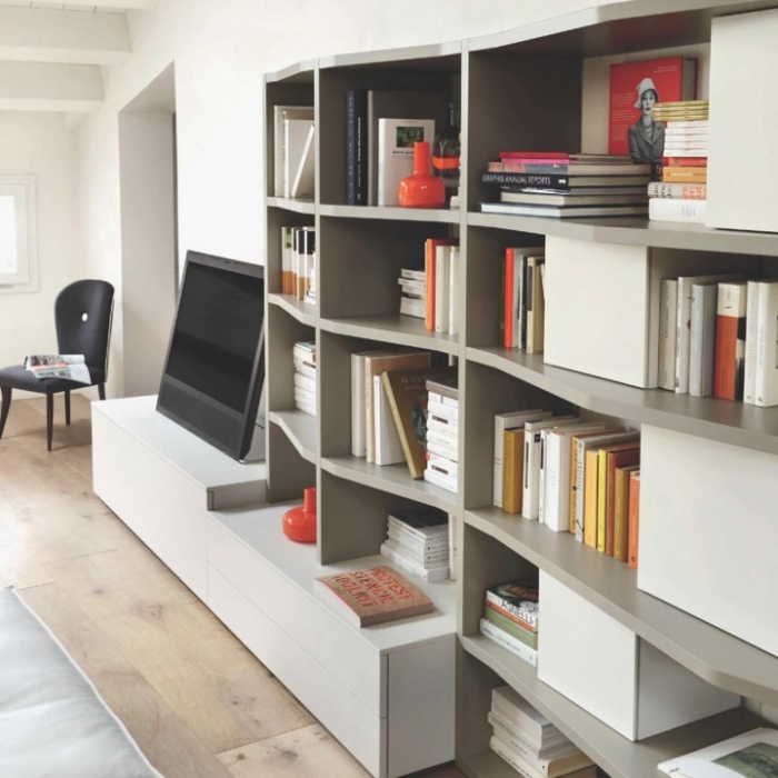 Per la scocca lucida di elementi con anta si intende l’esterno dei fianchi e relativi bordi perimetrali. L’interno e le schiene sono forniti con il corrispondente colore laccato opaco, mentre per elementi con cassetto l’interno è sempre tramato Juta.
