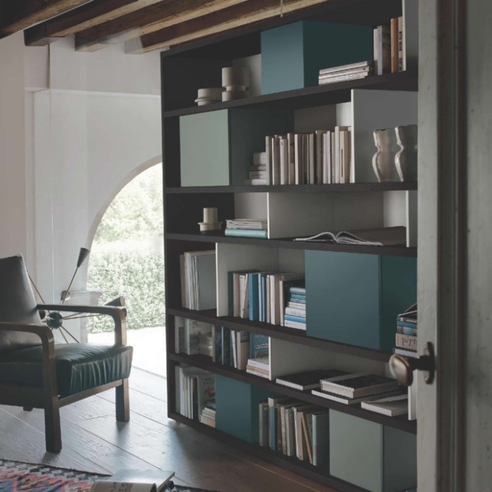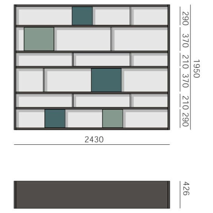 Struttura: (fianchi, divisori, schienali) materici ed essenze con venatura orizzontale - (ripiani) materici ed essenze con venatura orizzontale.Frontali: materici con venatura orizzontale fino ad altezza 1916 mm. Essenze con venatura orizzontale per i roveri tinti e noce o con venatura verticale per il rovere termotrattato.
