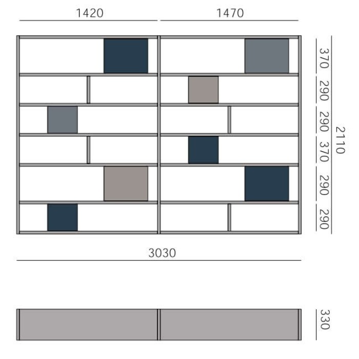 Struttura: (fianchi, divisori, schienali) materici ed essenze con venatura orizzontale - (ripiani) materici ed essenze con venatura orizzontale.Frontali: materici con venatura orizzontale fino ad altezza 1916 mm. Essenze con venatura orizzontale per i roveri tinti e noce o con venatura verticale per il rovere termotrattato.