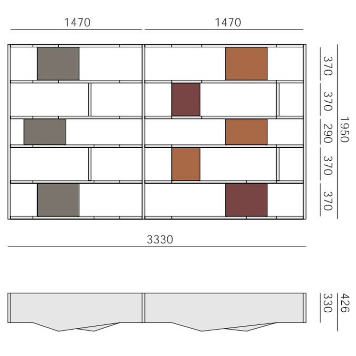 Struttura: (fianchi, divisori, schienali) materici ed essenze con venatura orizzontale - (ripiani) materici ed essenze con venatura orizzontale.Frontali: materici con venatura orizzontale fino ad altezza 1916 mm. Essenze con venatura orizzontale per i roveri tinti e noce o con venatura verticale per il rovere termotrattato.
