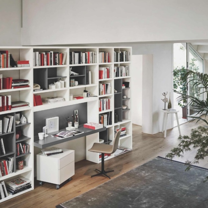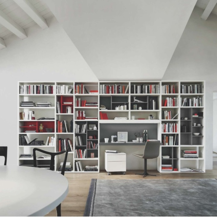 struttura con fianchi e ripiani modulari da 30 mm di spessore in materico bianco seta